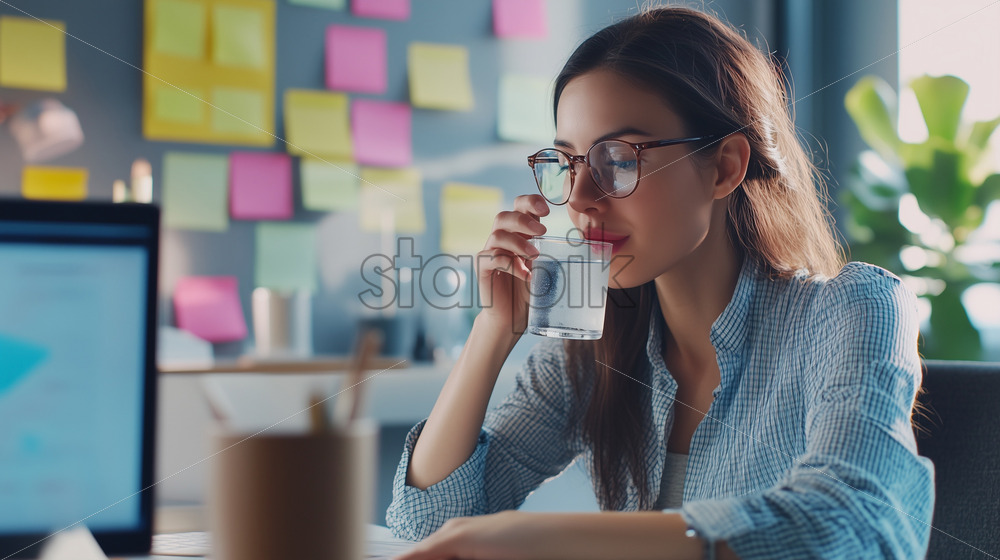 Home » Shop » AI Illustration » woman drinking lots of water while at work, hydration importance