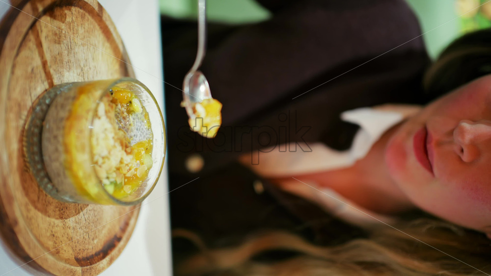 Woman eating a chia pudding in a glass cup using a spoon. Vertical