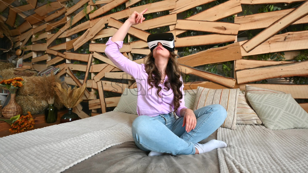 Woman looking through VR headset and jumping on bed Royalty Free Stock Video Footage Royalty Free Stock Video Footage