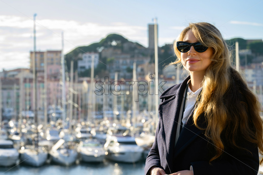 Cityscape of Cannes at evening, France. Multiple buildings near the sea port, Castre museum on a hill in the distance