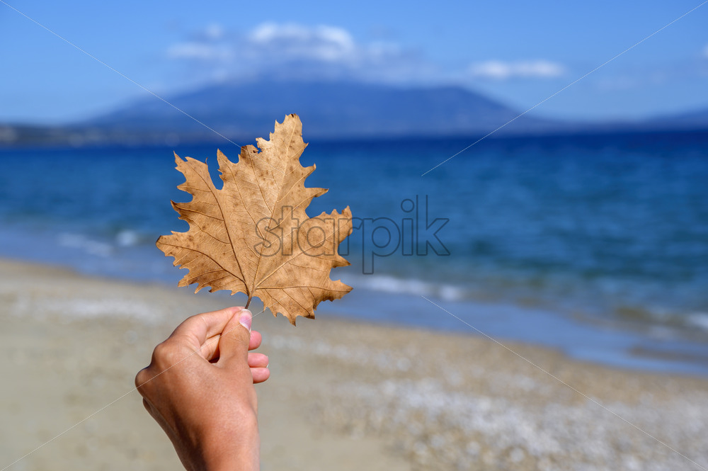Woman hand holding orange leaf at the beach in Asprovalta, Greece