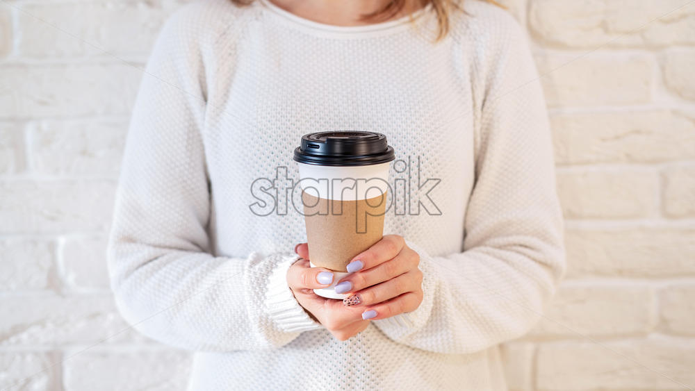 Woman in a warm sweater holding a mug winter, snowing, cold close up