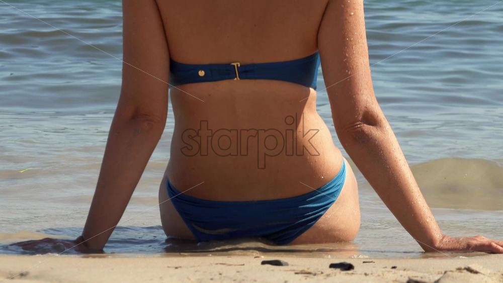 Woman in a blue bikini sitting at the waterline, arms braced behind her as small waves lap the beach Royalty Free Stock Video Footage
