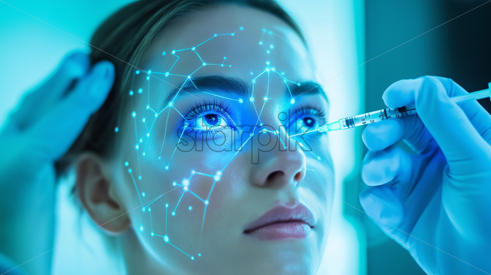 A young caucasian woman with blue eyes doing a facial massage using a roller, looking into the camera