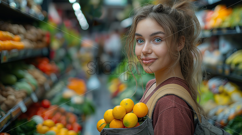 Woman picking oranges in a reusable bag in a store. Ecology and Earth Day thematics