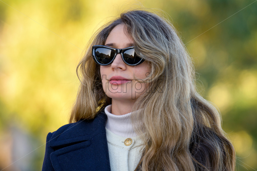 Woman in black sun glasses posing in Monaco near the beach, winter clothes, long hair