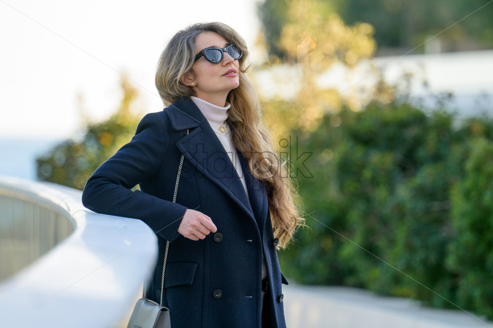 Woman in black sun glasses posing in Monaco near the beach, winter clothes, long hair