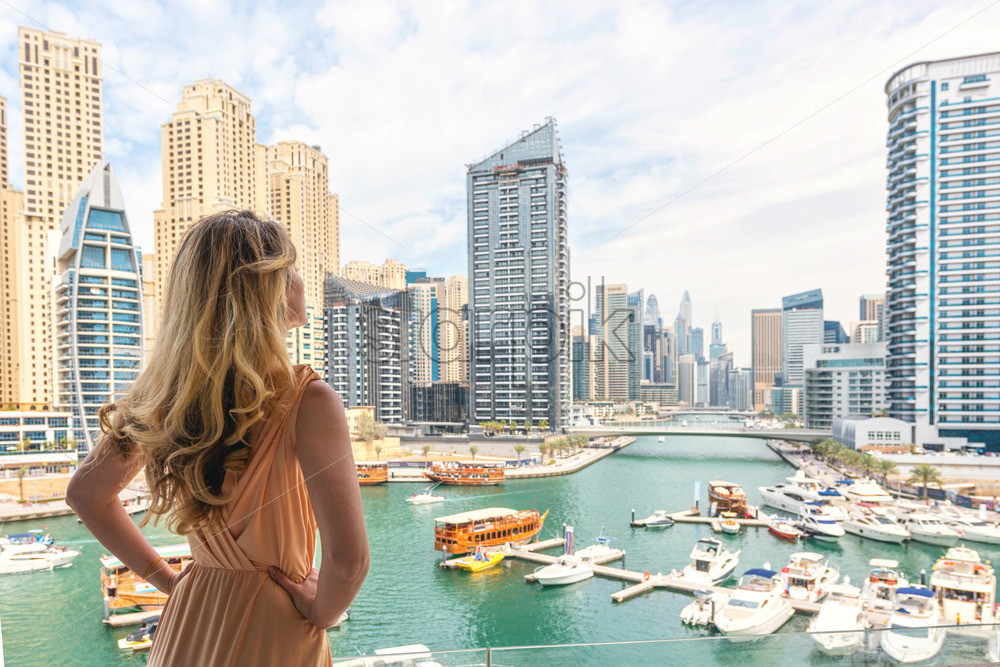 Woman in Dubai Marina, United Arab Emirates. Attractive lady wearing a long dress admiring Marina harbor daylight view
