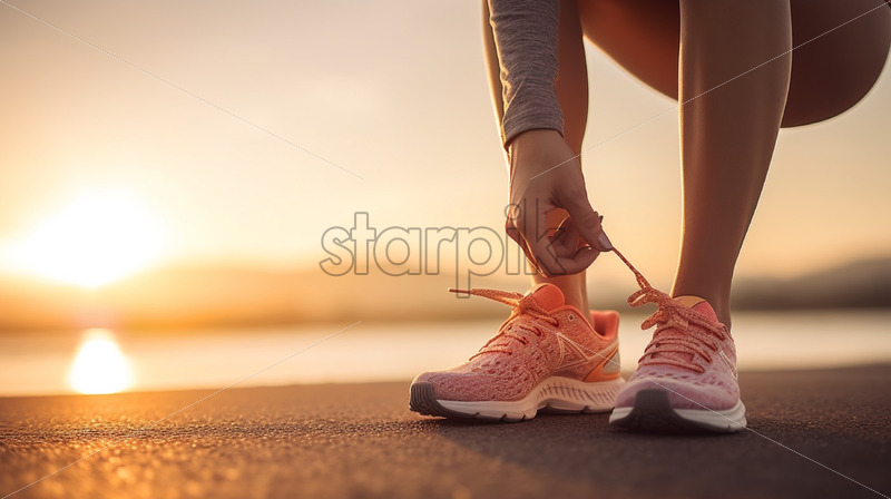 Woman in sneakers at sunset practicing sport