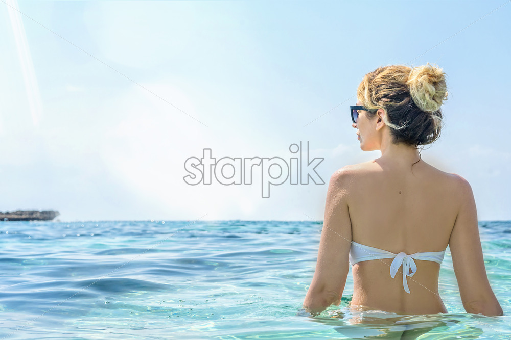 Woman in the sea, Cyprus. Beautiful Summer seaside view. Enjoying sunny day. Shot from behind