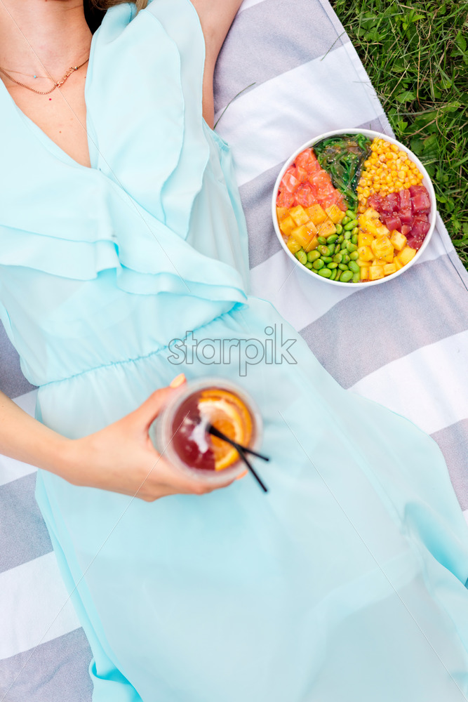 Home » Shop » photo » Woman laying on a blanket in the park holding a drink and poke bowl near her