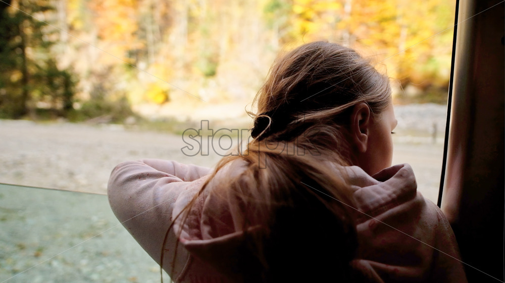 Woman leaned out of the window of the steam train Mocanita moving through a forest, Romania