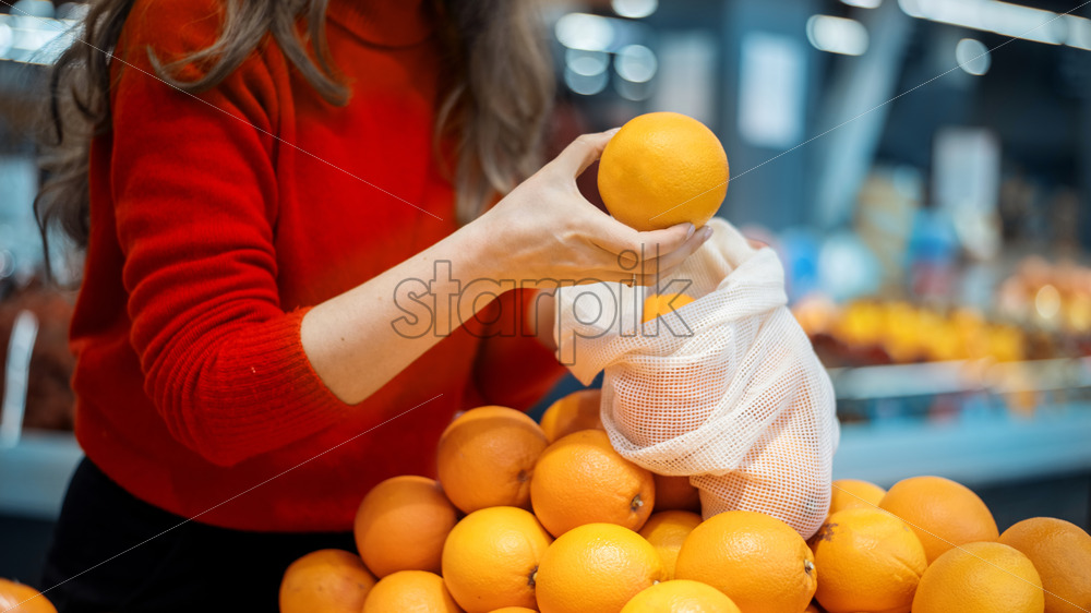 Home » Shop » photo » Woman picking oranges in a reusable bag in a store. Ecology and Earth Day thematics