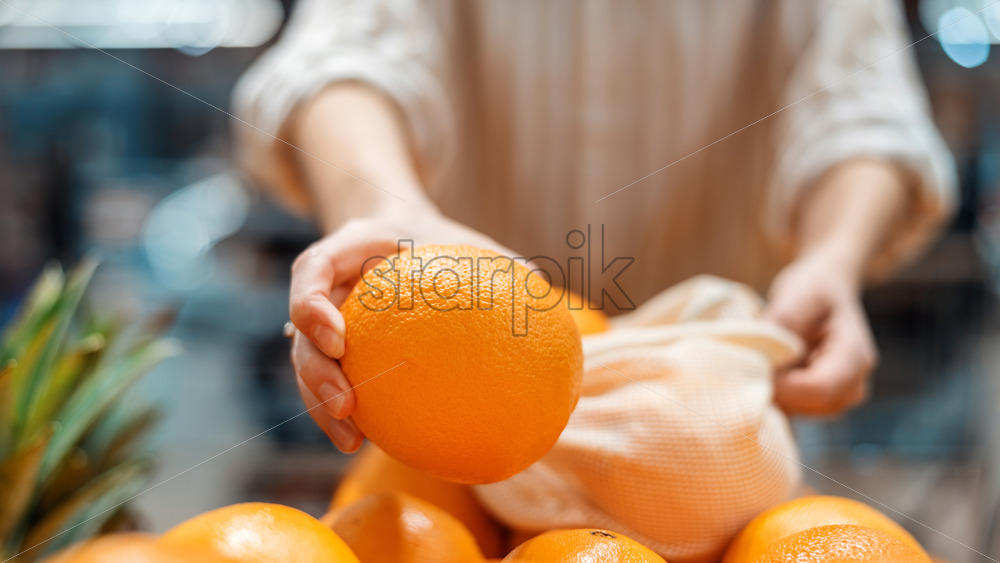 Home » Shop » photo » Woman picking oranges in a reusable bag in a store. Ecology and Earth Day thematics