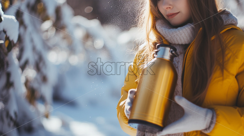 Woman pouring tea from a thermos outdoors cold winter