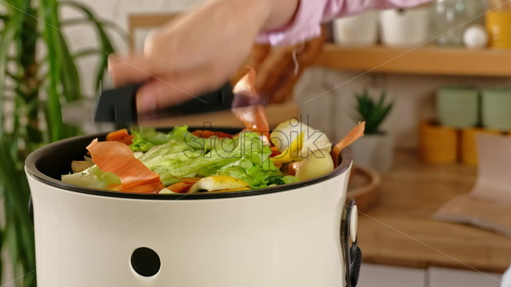Home » Shop » 1 Video » Video – Woman recycling organic waste by composting vegetables peels in the Bokashi in the kitchen