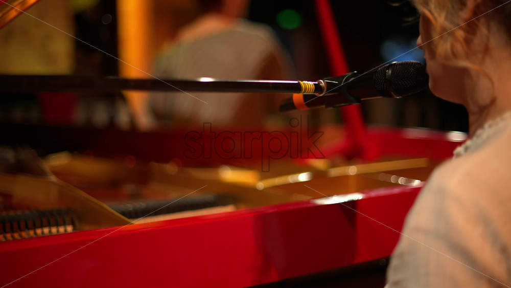Woman singing into the microphone and playing a red piano Royalty Free Stock Video Footage Royalty Free Stock Video Footage