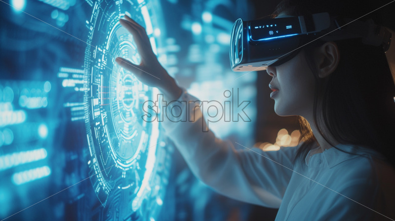 holographic user interface being manipulated by a person in augmented reality glasses in front of a quantum computer