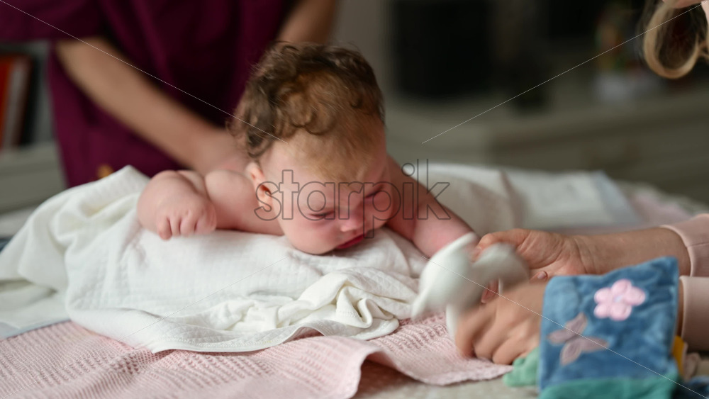 Woman trying to distract a crying baby lying on a blanket during massage with a toy