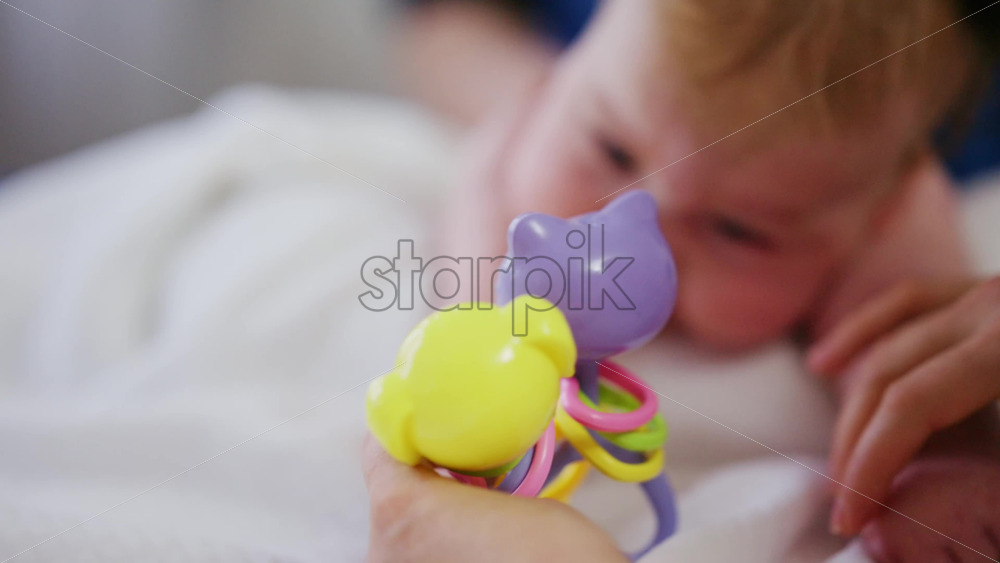 Woman trying to distract a crying baby lying on a blanket during massage with a toy