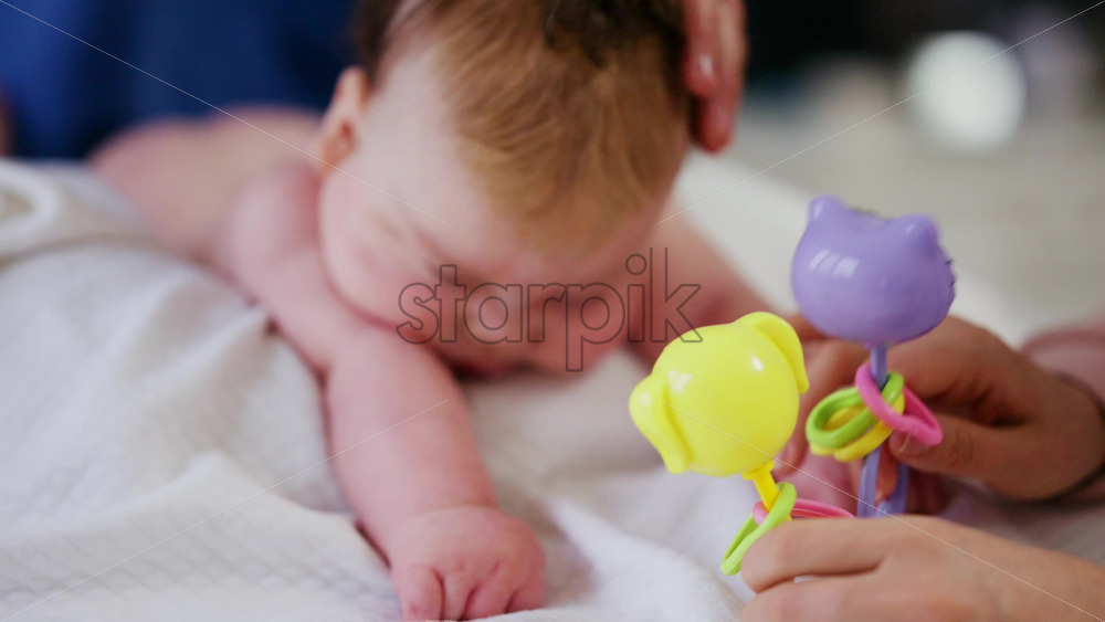 Woman trying to distract a crying baby lying on a blanket during massage with a toy