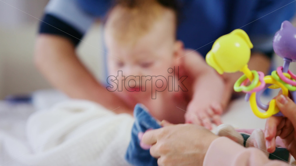 Woman trying to distract a crying baby lying on a blanket during massage with a toy