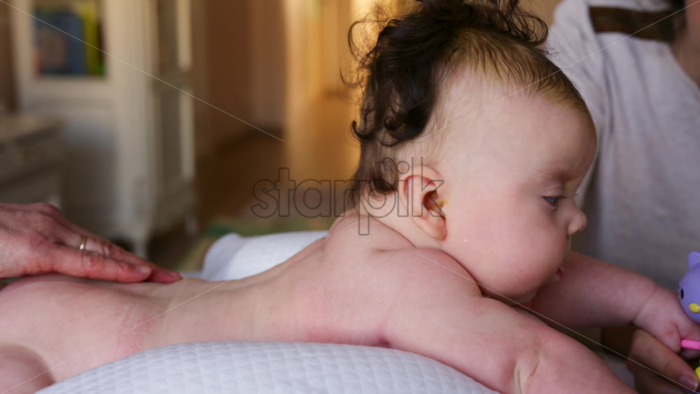 Woman trying to distract a crying baby lying on a blanket during massage with a toy