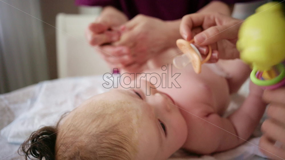 Home » Shop » 1 Video » Woman trying to distract a crying baby lying on a blanket during massage with a toy