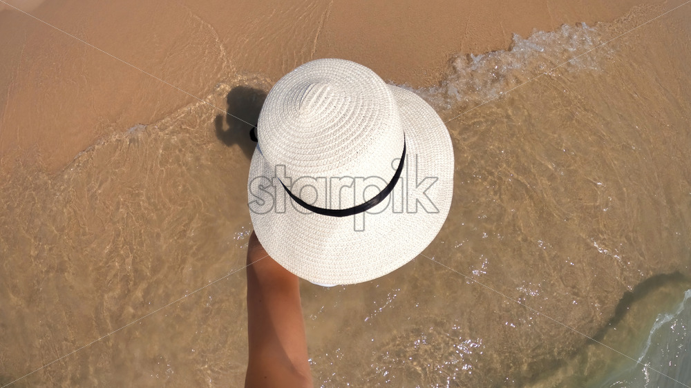 Woman in white hat walking on the Mediterranean sea coast. Holding the camera above the head