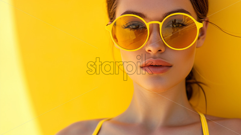 Woman wearing yellow swimming suit and a rounded yellow sunglasses