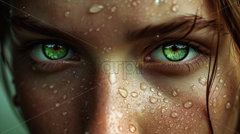 Woman with green eyes and water drops on her face