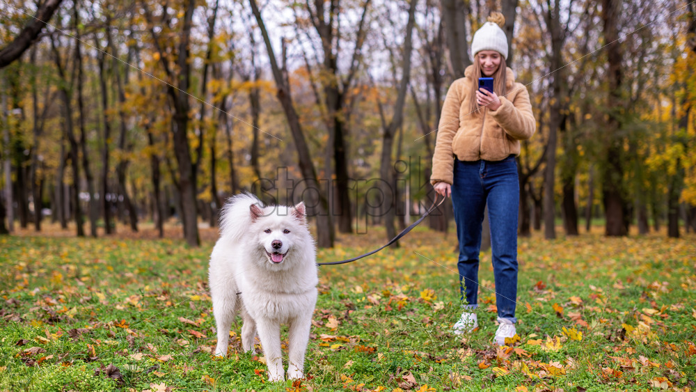 Woman with her dog in autumn in a park. Woman is on her phone and holding the leash, smiling. Greenery around