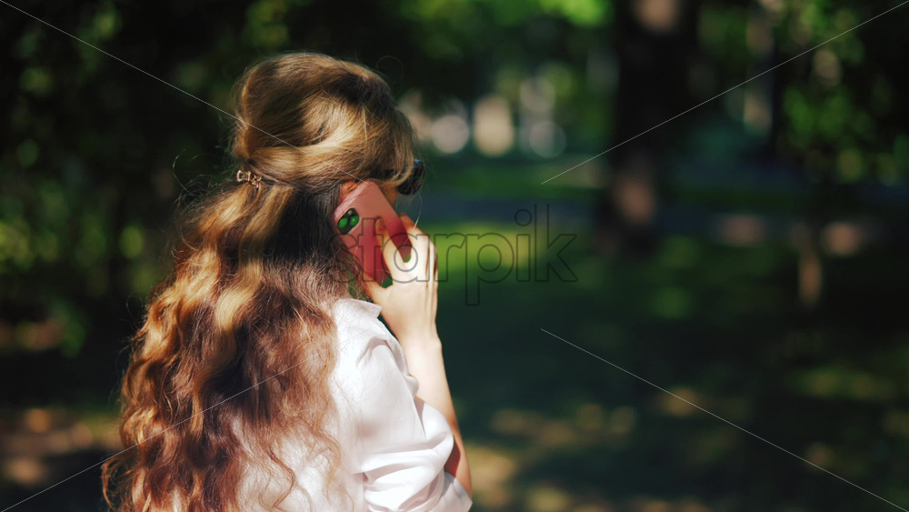 A woman with long curly hair texting on her phone while sitting on a park bench near a stroller, surrounded by greenery Royalty Free Stock Video Footage