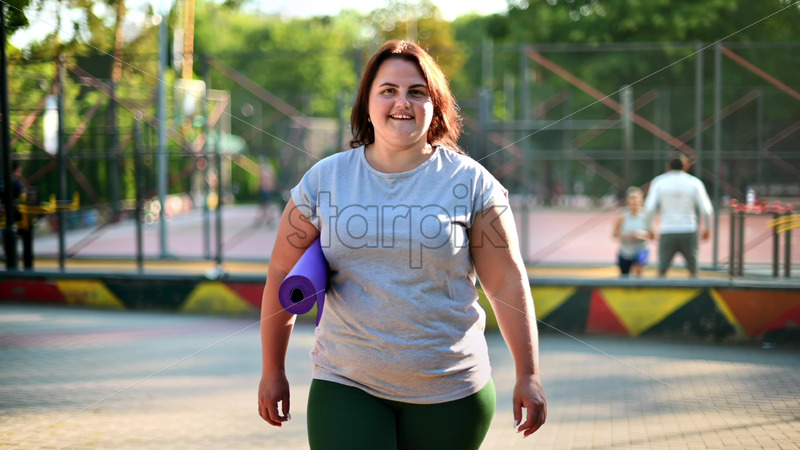 Woman with overweight in grey t-shirt and leggings walking on a sports field in a park while holding a yoga mat. Fitness lifestyle. Looking at the camera