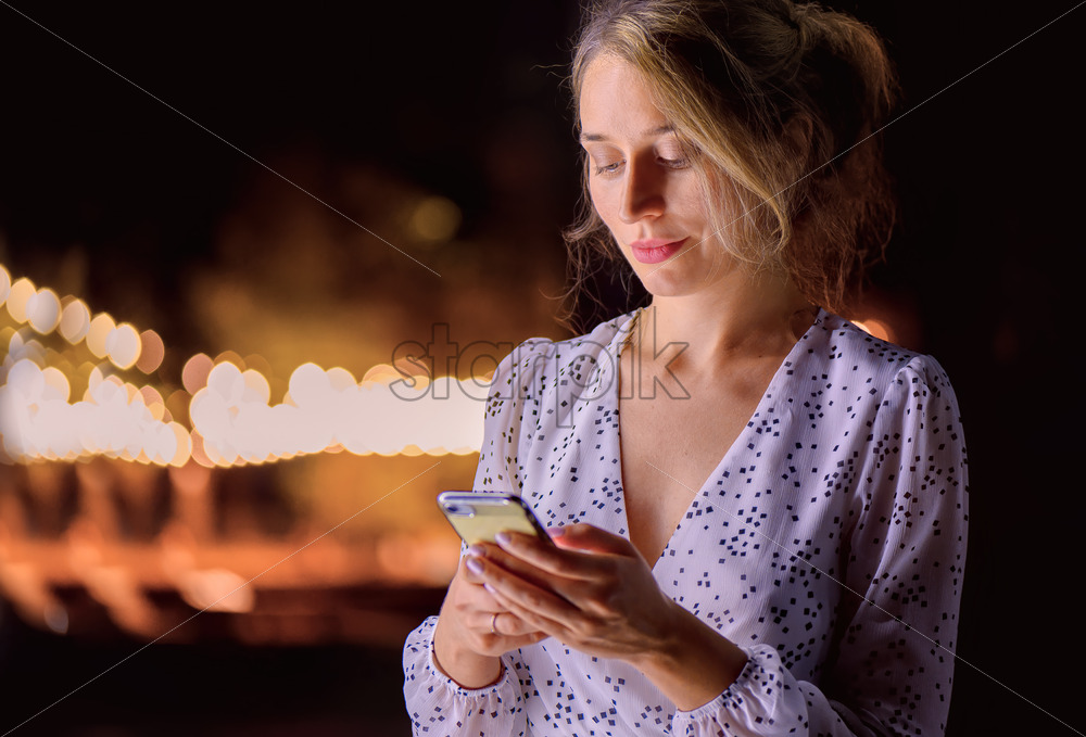 Woman with phone night portrait city lights bokeh. White dress lovely evening scene