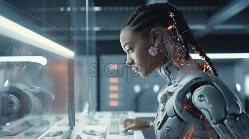 Group of young people discussing and doing experiments in robotics in a laboratory. Robot on the table, virtual reality Royalty Free Stock Video Footage