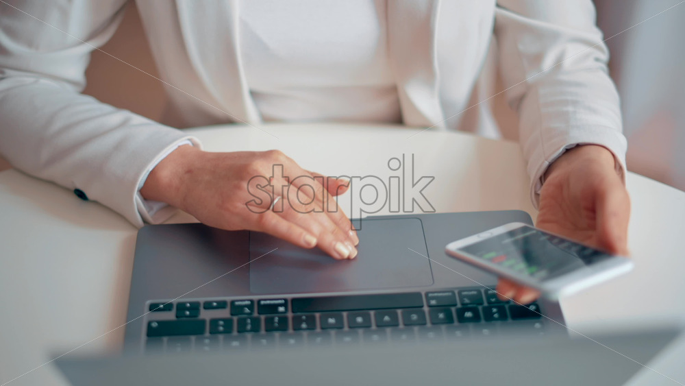 Woman in white suite working on notebook and mobile phone at the office, checking financial stock charts. Download royalty free stock video footage. Royalty Free Stock Video Footage