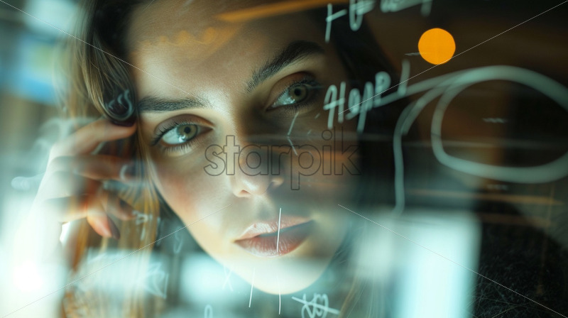 Woman writing on a glass technology innovations, formulas