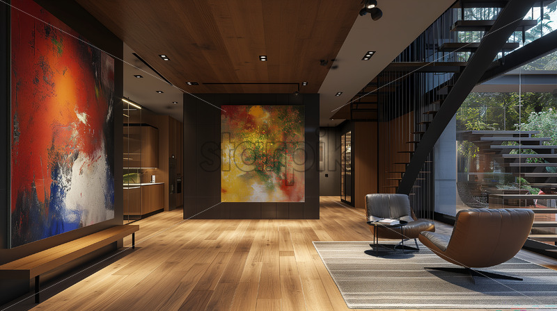 An indoor photograph showcasing the modern elegance of a house, featuring a wood-themed living room with large canvas paintings, two leather chairs, a black minimalist staircase, wooden ceiling, ample lighting, and large glass wall panels that provide a view of the garden from the inside.