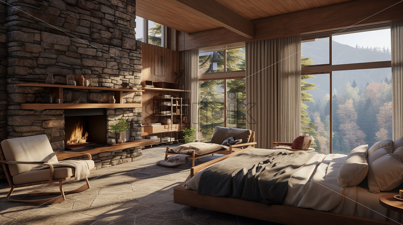 Aesthetic wooden Cafe in the country side with clear glass wall and classic wood table and chair, cozy couch with an elegant ambience with aesthetic theme