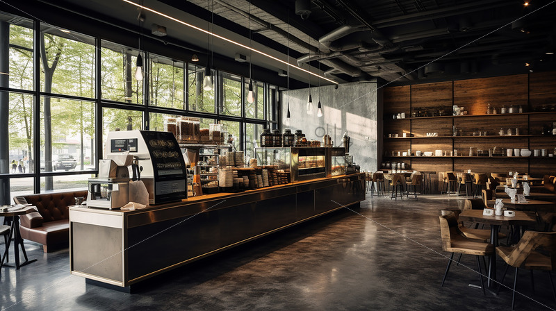 Wooden cafe architecture in the city with a clear glass wall and brown classy chair in a refreshig ambience and a classy counter