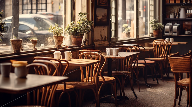 Wooden cafe architecture in the city with a clear glass wall and brown classy chair in a refreshig ambience and a indoor plants
