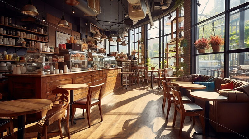 Wooden cafe architecture in the city with a clear glass wall and brown classy chair in a refreshig ambience