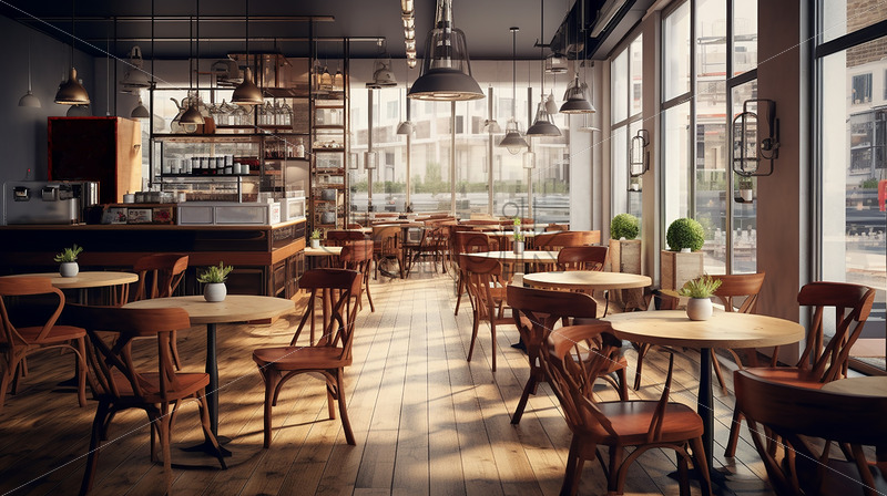 Wooden cafe architecture in the city with a clear glass wall and wooden classy chair and a wooden counter chair in a refreshig ambience and indoor plants