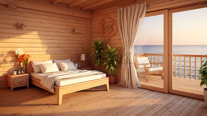 Home » Shop » Uncategorised » Wooden vacation house in the beach side, clear glass sliding door, balcony, beach chair and a classy bedframe with indoor plants in a wood theme with neat ambience