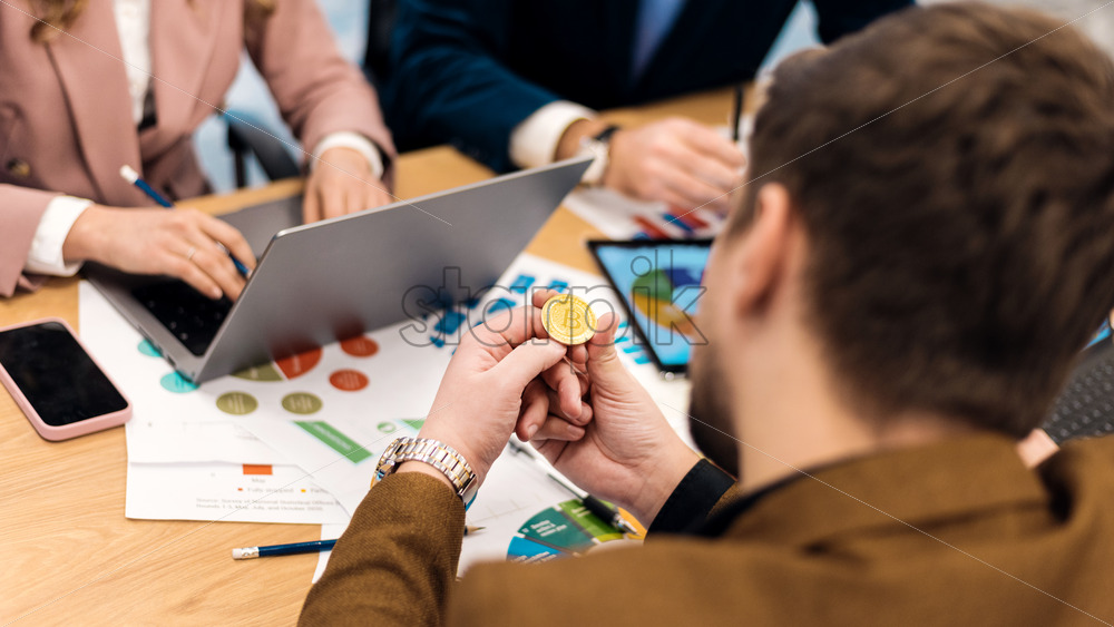 Worker holding a physical cryptocurrency coin in an office. Gadgets and papers on the table