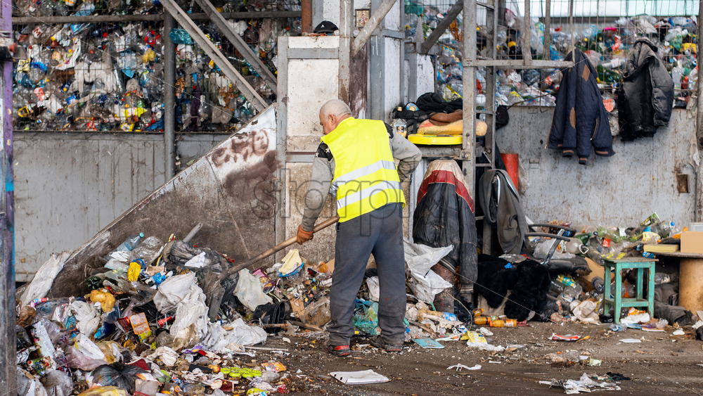 Home » Shop » photo » Worker pushing garbage to a conveyor belt at waste sorting plant