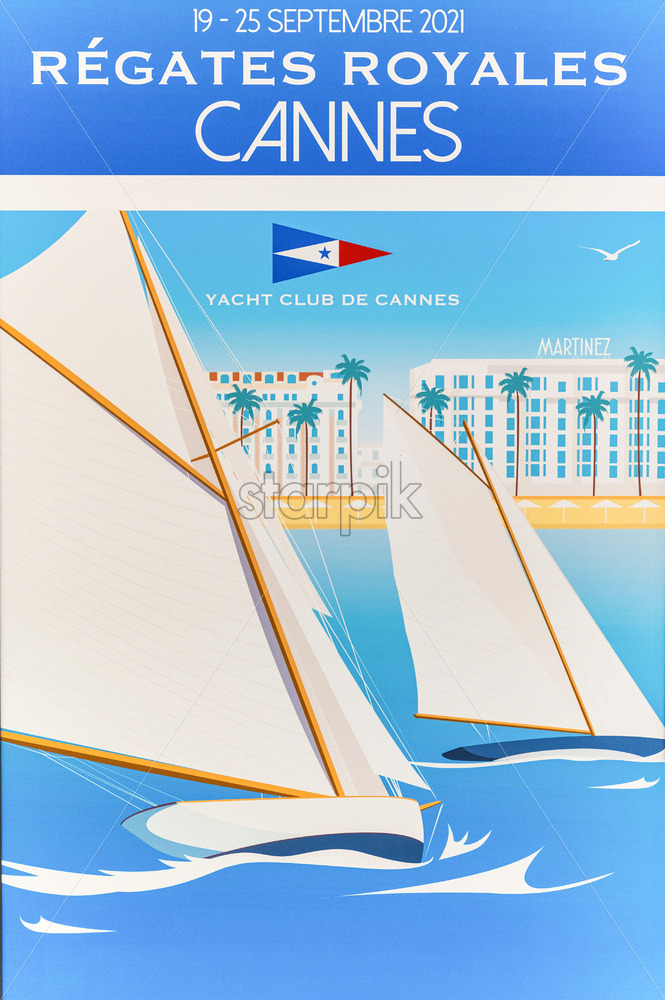 CANNES, FRANCE – SEPTEMBER 12, 2021: View of the cote d’Azur at sunset. Coast with restaurants, sea port with moored yachts, water of the Mediterranean sea