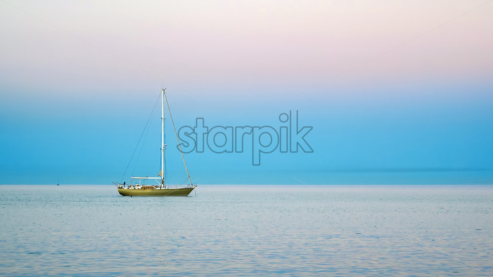 Floating yacht on Mediterranean sea coast in Barcelona at sunset, Spain