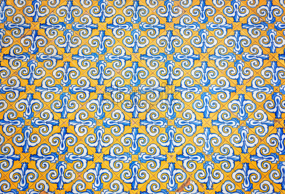 Yellow onramented pattern on a building in Valencia, Spain. Vibrant colors in the scene